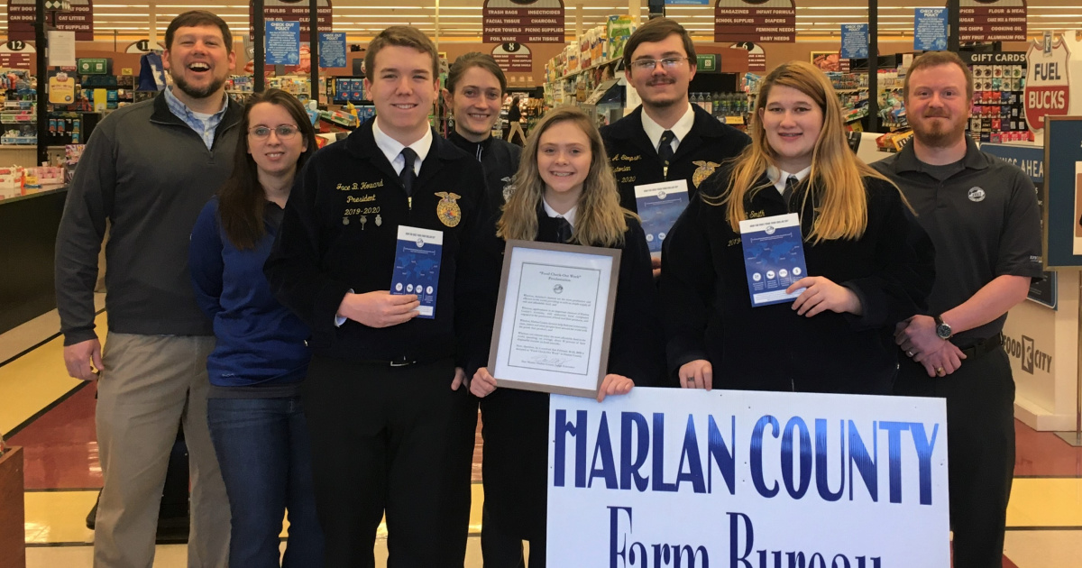 Harlan County Farm Bureau celebrated Food Check-Out Week February 16-22, 2020. Dan Mosley, Judge Executive, signed the Food Check-Out Week Proclamation and the Harlan County Farm Bureau Women’s & Young Farmer Committees partnered with Harlan County High School’s FFA to promote Food Check-Out Week and National FFA Week. Together they distributed information at local Grocery stores about FFA and Food Check-Out Week.
