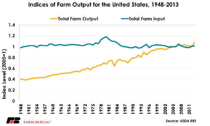 Data from USDA Economic Research Service backs up what we know to be true with data. Nigh highlighted that total U.S. farm output increased 169 percent between 1948 and 2013, while total farm inputs have basically stayed steady, increasing only three percent over the same time period.